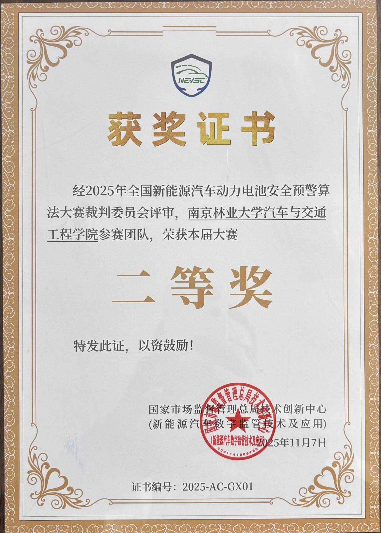 此次获奖不仅是对团队技术实力与创新能力的高度肯定,更彰显了我院主动服务国家新能源汽车产业战略、赋能行业高质量发展的责任担当。团队研发的智能预警技术,为动力电池安全预警提供了高效可行的创新方案,既有助于化解消费者安全顾虑,更将为新能源汽车产业高质量发展注入强劲动力。同时,该成果充分展现了学院在新能源汽车领域的雄厚学科积淀与优质人才培养成效,为行业持续输送兼具创新思维与实践能力的高素质科研人才,为我国新能源汽车安全技术升级贡献南林智慧与力量。